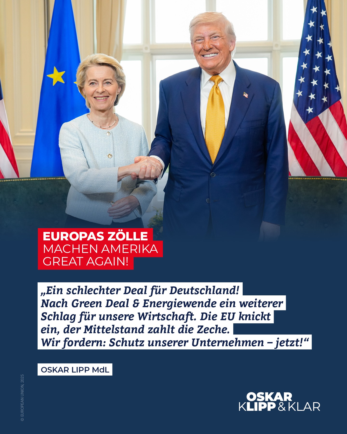 Der sogenannte Zoll-Deal zwischen der EU und den USA ist ein weiterer Schlag ins Gesicht der deutschen Wirtschaft. Nach dem desaströsen Green Deal und der irrationalen Energiewende, die unsere Unternehmen bereits an den Rand der Wettbewerbsfähigkeit gebracht haben, wird nun ein weiteres ruinöses Kapitel aufgeschlagen. Die vereinbarten Zölle von 15 Prozent auf die meisten Exporte und 50 Prozent auf Stahl und Aluminium sind ein untragbarer Kompromiss, der unsere Schlüsselindustrien – von der Automobilbranche bis zur Chemie – massiv schädigt. Dieser Deal ist kein Erfolg, sondern ein Offenbarungseid der EU, die erneut vor den Forderungen Trumps eingeknickt ist.