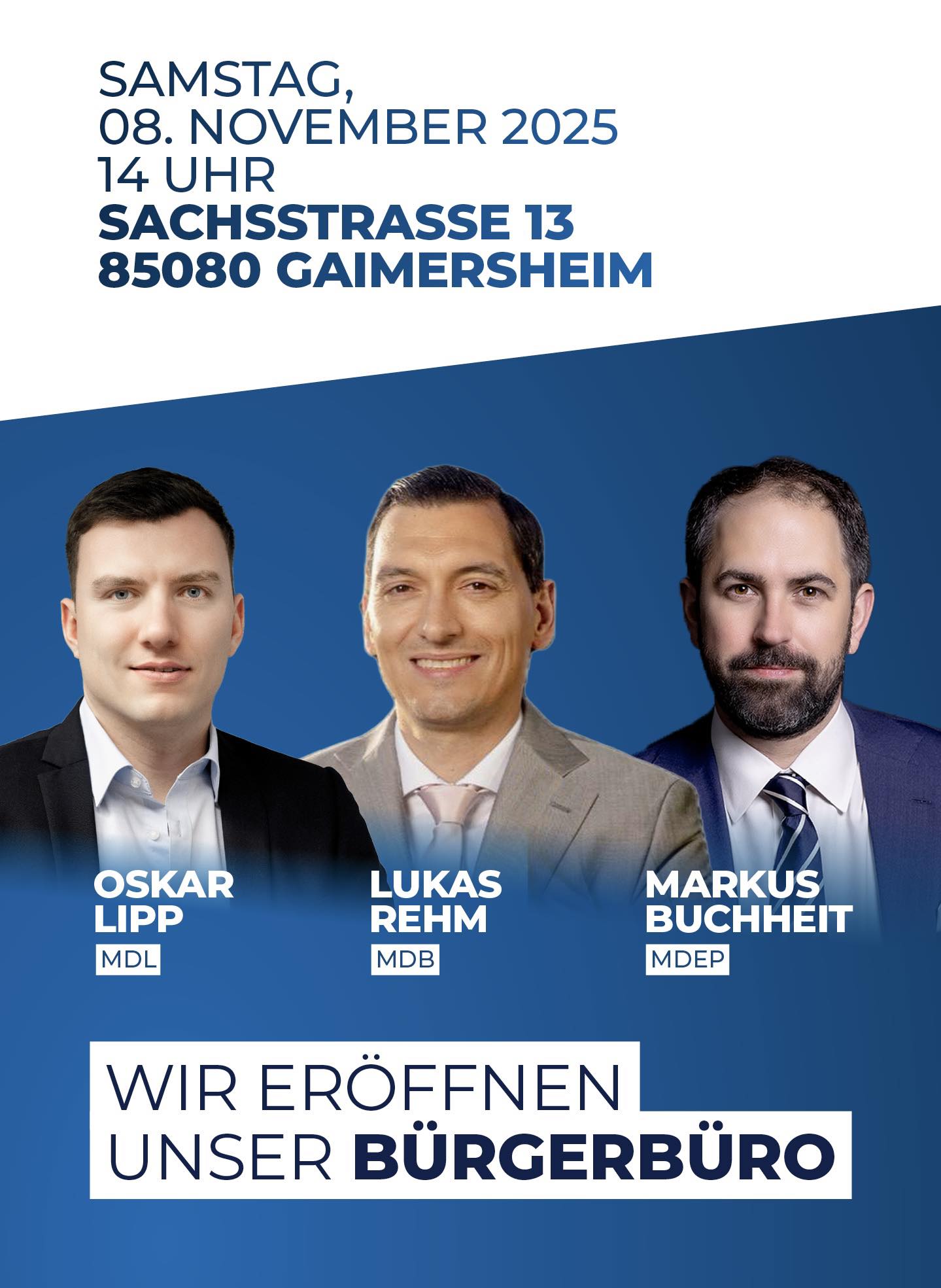 wir freuen uns, Sie herzlich zur Eröffnung unseres neuen Bürgerbüros einzuladen! Am Samstag, den 08. November 2025, um 14 Uhr öffnen wir die Türen in der Sachsstraße 13, 85080 Gaimersheim.