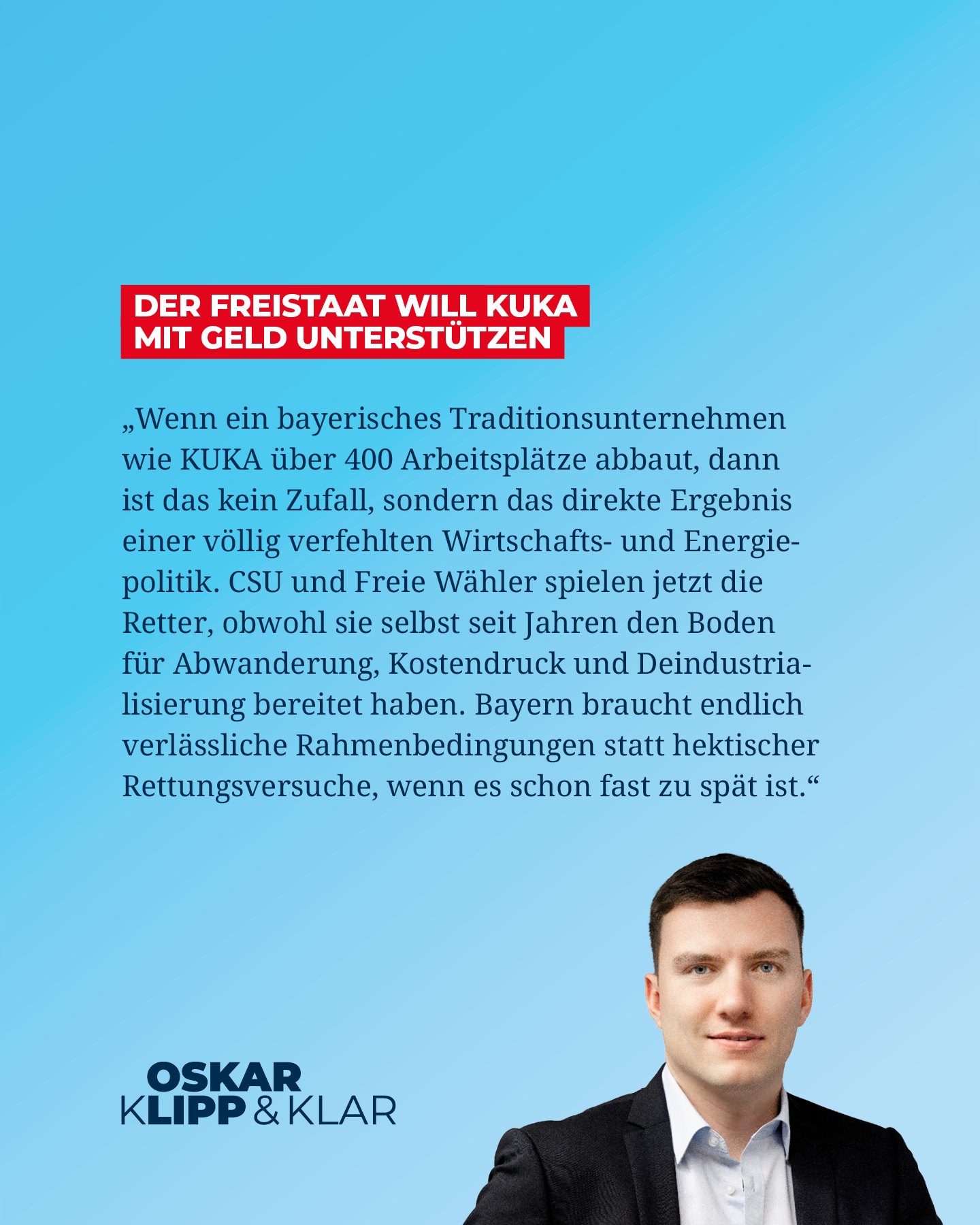 Der angekündigte Stellenabbau bei KUKA (wurde vom chinesischen Investor Midea aufgekauft) ist ein weiterer schwerer Schlag für den Industriestandort Bayern. Wieder trifft es ein Traditionsunternehmen – und wieder kommt aus München nur hektische Krisen-PR statt echter Lösungen.
