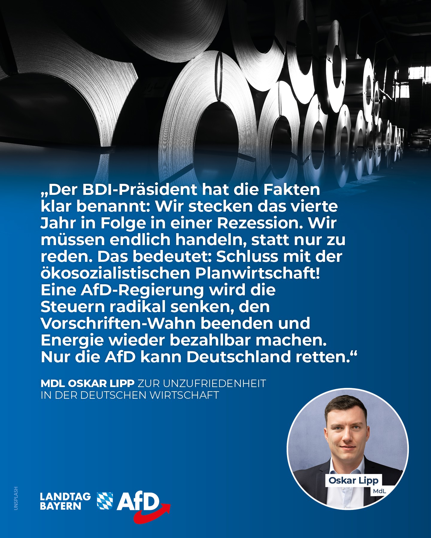 Oskar Lipp, wirtschafts- und industriepolitischer Sprecher der AfD-Fraktion im Bayerischen Landtag, stimmt zu: